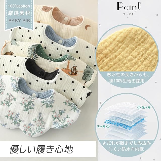 内側しっかり防水素材:吸水性と通気性を考えてふんわりソフトに仕上げた6重ガーゼを使用しています。ヨダレをたっぷり吸収してくれ、お洗濯の枚数が減らせます。中に撥水シートを挟んでいるので、たくさん汚れても裏に染み込みずらくなっています。