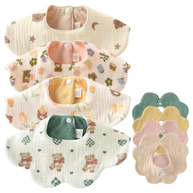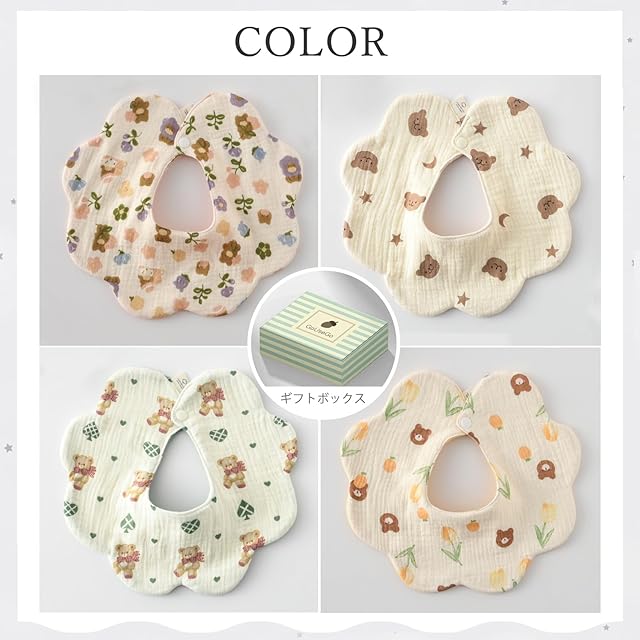 [GoUseGo] ベビー 防水スタイ 両面リバーシブル 4枚セット ガーゼ地 七層構造 赤ちゃん ふんわり 360度スタイ 花びら 女の子 男の子 よだれかけ 無地 おしゃれ 新生児ギフト 出産準備 出産祝い