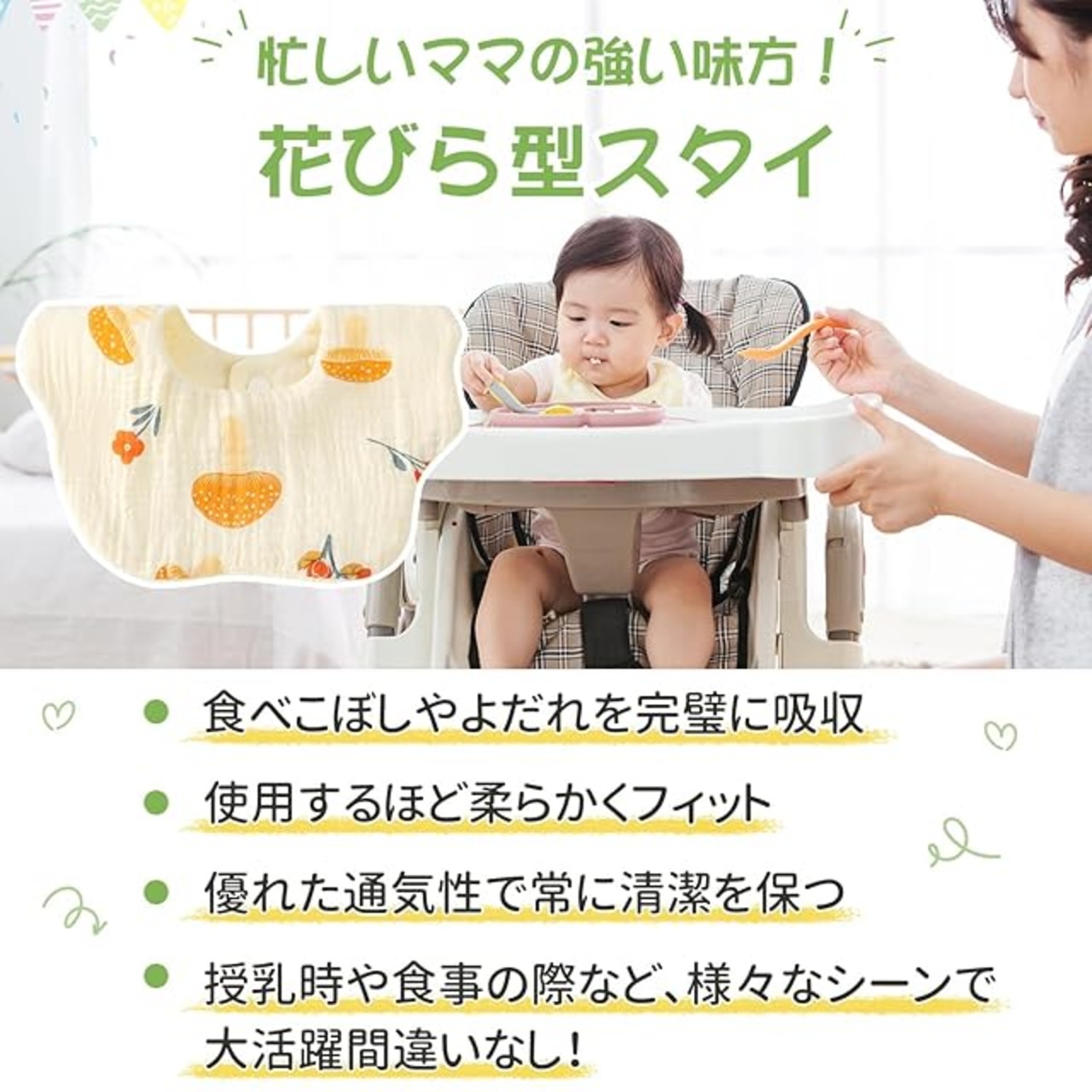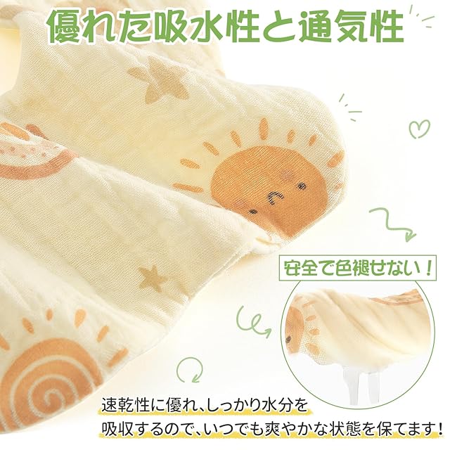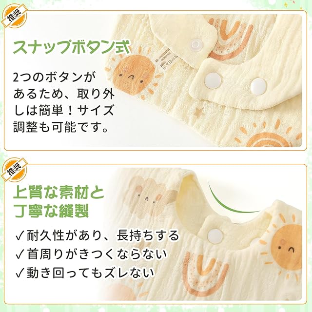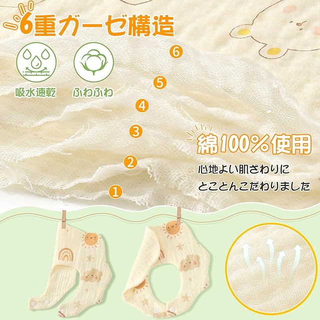 【やさしい着ごこち】通気性、吸収性に優れた6重ガーゼを使用。天然素材なので、やさしい手触りを実現し、赤ちゃんを食事中でも清潔に保つことができます。ガーゼ素材独特の速乾性で、洗った後もすぐに乾かすことができるので便利です。