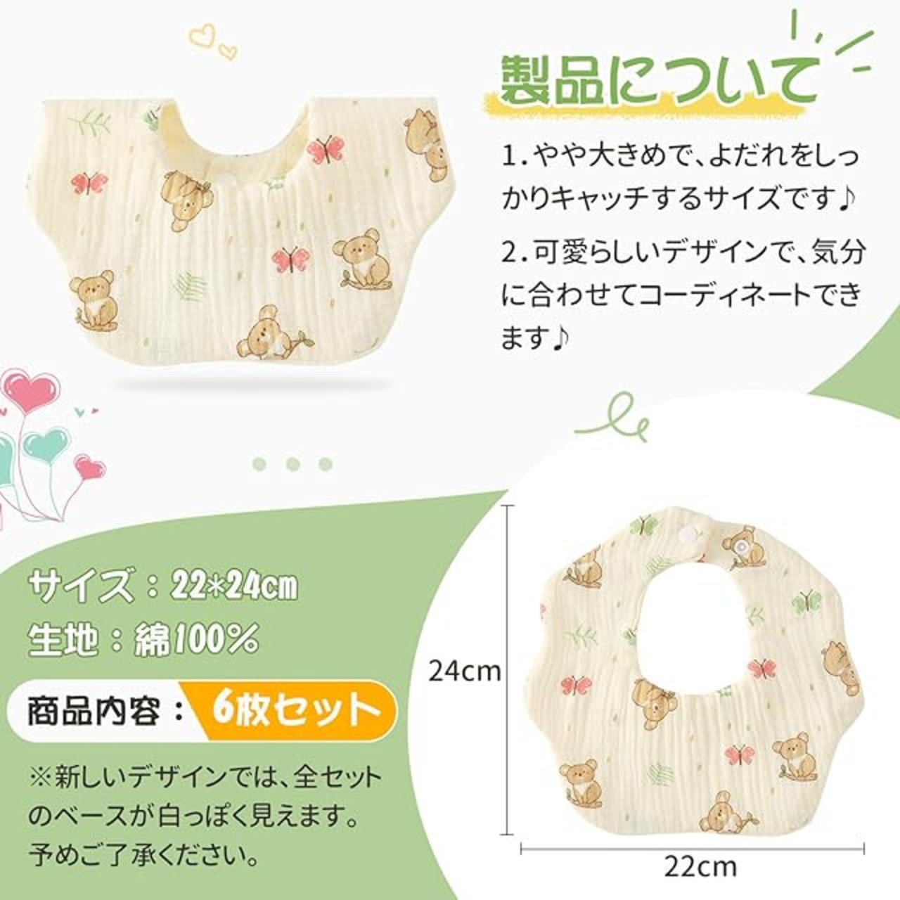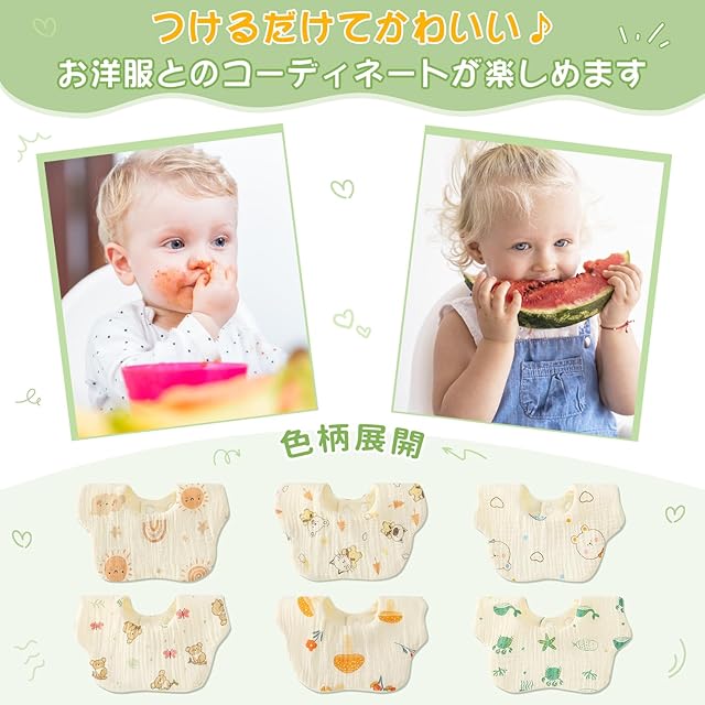 【商品説明】パッケージ:6枚セット;サイズ:22×24cm。 可愛いデザインで、どんな服にも合わせやすく、お子さまの可愛さを引き立てます。洗濯方法:丸洗い可能。繊細な赤ちゃんの肌に「触れる」ものだから、こだわりの厳選素材を使用しています。