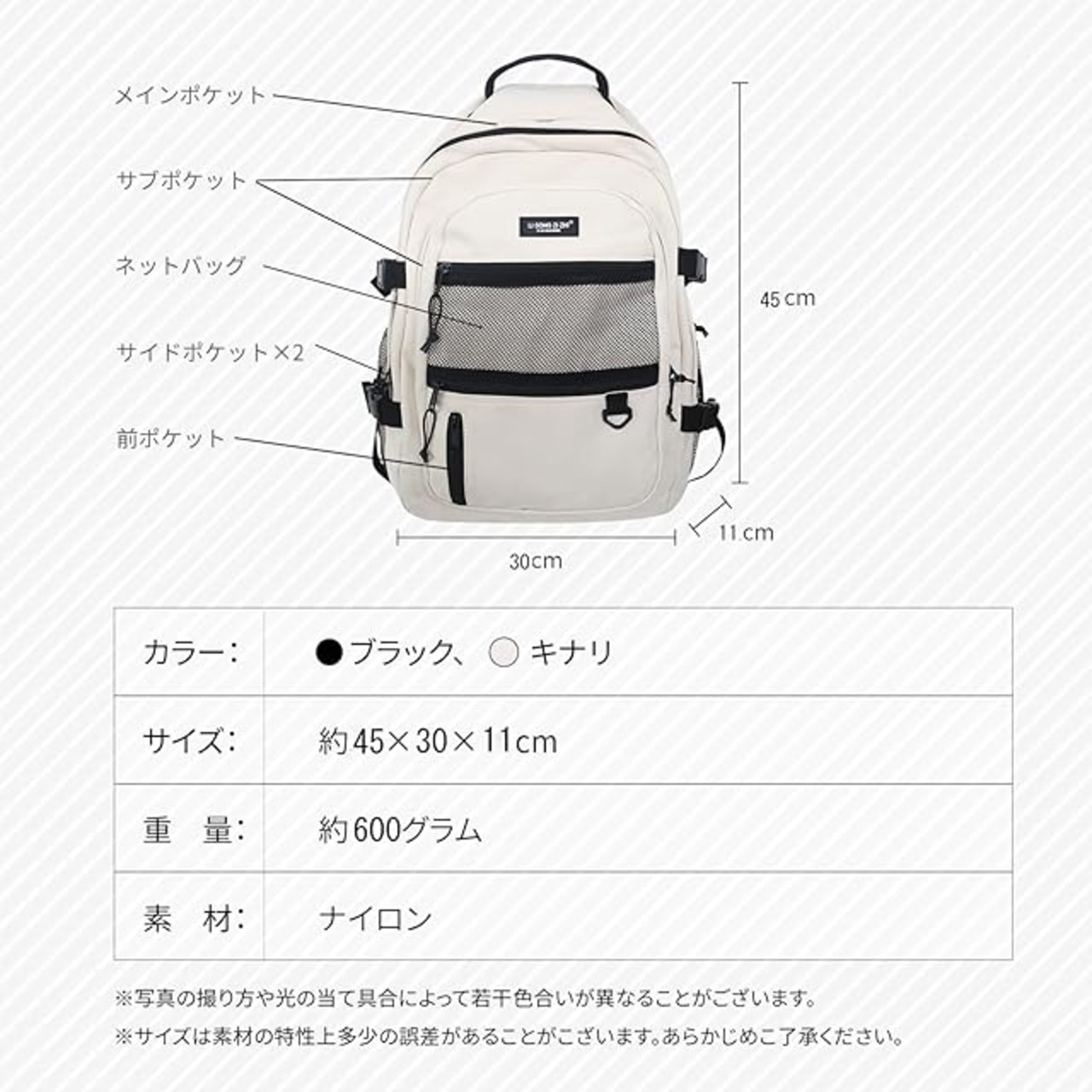 【耐久耐圧】表地:ナイロン 裏地:ナイロン 上質な素材を採用のりゅっく、防滴性・耐磨耗性に優れています。緻密な縫製で破れやすい箇所を補強し、バッグの耐久性をアップさせます。バックの背面部にはドランクに固定られるベルトがあり、長時間背負時に肩の負担を軽減します。