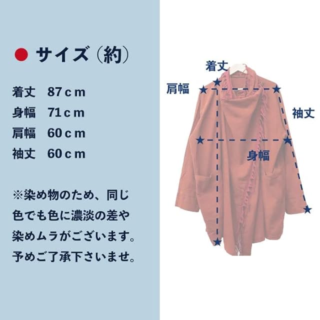 <p>染め感が作り出す雰囲気、個性派アウター♪</p><p></p><p> ●サイズ(約) フリーサイズ<br> 着丈 87cm<br> 身幅 71cm<br> 肩幅 60cm<br> 袖丈 60cm<br> ※多少の誤差はご了承ください。 </p><p> ●素材<br> コットン100% </p><p> ●生産国<br> タイ </p><p> ●特徴<br> ストーンウォッシュによる独特の雰囲気がある個性派アウターです。 外側と内側のボタンを外すことで雰囲気を変えて着こなせます。 またオーバーサイズに着ていただくことで、男性から女性まで幅広く使っていただけます。 ポケットは左右に1つずつ付いています。モデルは165cmの男性です。 </p><p> ●注意点<br> 染め物のため、同じ色でも色に濃淡の差や染めムラがございます。検品をしておりますが、時折ほつれていることがあります。その他、色やサイズなどは実際と若干異なる場合がございます。予めご了承ください。 また、擦れや洗濯などによる色移りがあることがございますのでご注意ください。</p>