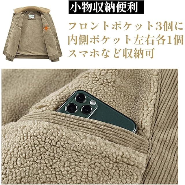 【防寒・防風】表面と裏地はコーデュロイとボアで作られており、優れた防風性、保温性、手触りを備えています。寒さに強く、防風保温に優れ、暖かく着られます。裏起毛で暖かく柔らかい肌触りが特徴のあるジャケットです。