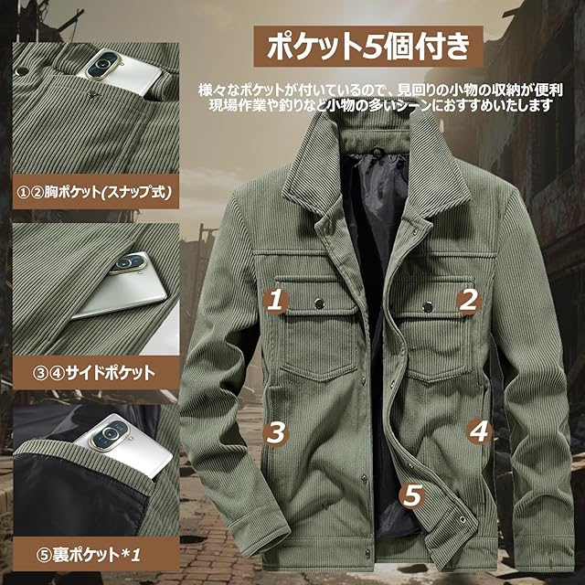 [Manatsulife] ジャケット コーデュロイ メンズ 折り襟 防風 保温 撥水 暖かい 羽織り 作業服 アウトドア 釣り 山登り 秋服 冬 カジュアル おしゃれ WT2266 (3XL, カーキ)