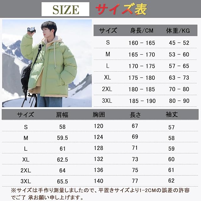 【S】身長:160-165cm 体重:45-52kg;【M】身長:165-170cm 体重:53-60kg;【L】身長:170-175cm 体重:57-65kg;【XL】身長:175-180cm 体重:63-73kg;【2XL】身長:180-185cm 体重:70-80kg【3XL】身長:185-190cm 体重:80-90kg。