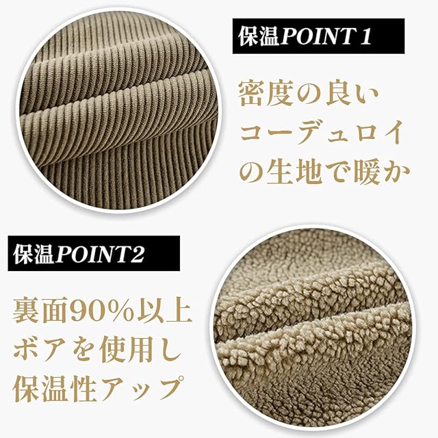 【防寒・防風】表面と裏地はコーデュロイとボアで作られており、優れた防風性、保温性、手触りを備えています。寒さに強く、防風保温に優れ、暖かく着られます。裏起毛で暖かく柔らかい肌触りが特徴のあるジャケットです。