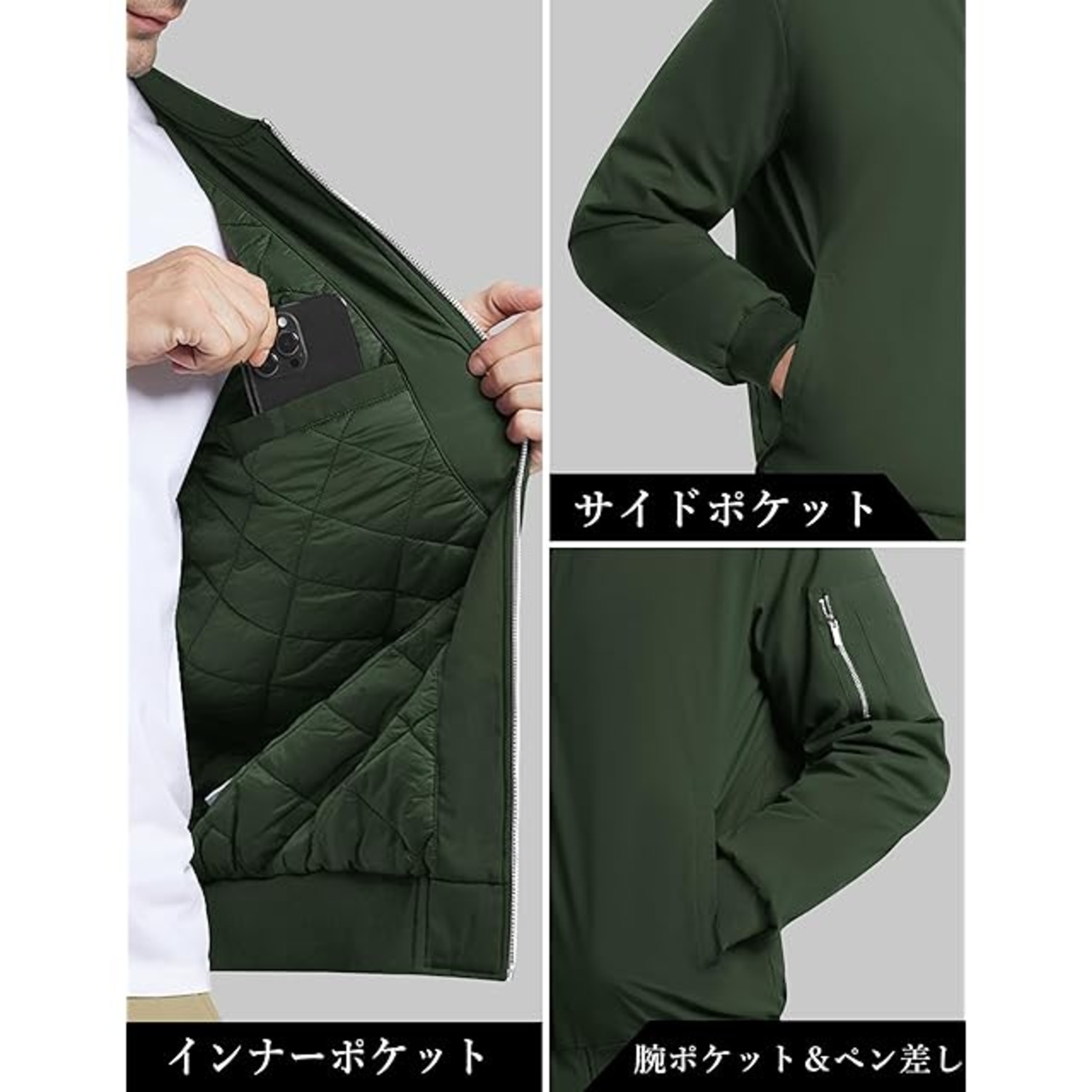 商品名:[KEFITEVD] ジャンパー メンズ 防寒 キルティングジャケット 無地 ボンバージャケット 中綿 ブルゾン ポケット付き 撥水 アウトドア ブルゾン 防風 バイク グリーン 2XL