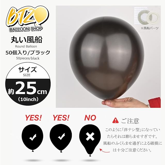 ■風船カラー:ブラック(パールカラー)/内容物 :50個入り(粘着シール1枚、リボン1巻、バルーンチェーン1巻付き)/サイズ:10インチ(25cm)/ヘリウムガス、空気用に使用できます。/注:風船についている粉で、最も一般的なのは「タルク」です。人体に悪影響をおよぼすことがなく、ラテックスバルーンを製造する過程で、離型剤のような存在。ご理解をいただけた方のみご購入をお願いいたします。