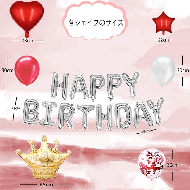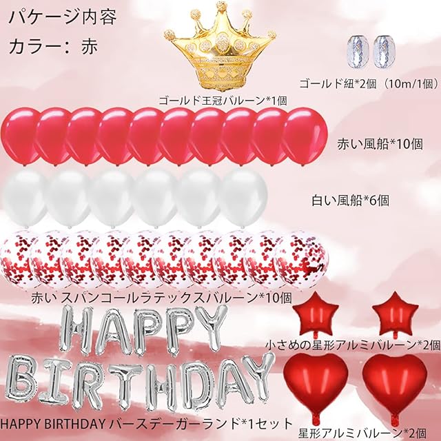 ♥♥♥商品詳細♥ 本セットの内容:①ゴールド王冠バルーン*1個(約25*35cm) ②笑う「HAPPY BIRTHDAY」バースデーガーランド*1セット(約25*35cm) ③赤い風船を*10個(約直径33cm) ④赤い スパンコールラテックスバルーン*10個(約直径40cm) ⑤白い風船を*6個(約直径33cm) ⑥アルミハートバルーン*2個(約38*38cm) ⑦小さめの星形アルミバルーン*2個(約22*22cm) ⑧銀紐*2個(10m/1個)それで、すぐ飾り付けができる風船セットです。かわいいシェイプで誕生日雰囲気を盛り上げましょう。
