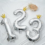 【かわいい“♛”が数字バルーンに!】シルバーの数字バルーンにゴールドの王冠を付けて新しい仕様です!シルバー×金の色合いはシックでありながら華やかな印象に・・!お誕生日会や記念日などのお祝いに、ちょっぴり華やかさをプラスしたこんな数字バルーンを飾るのはいかがでしょうか?