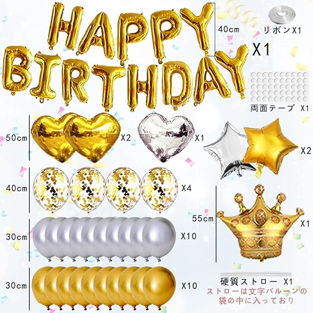 ① 誕生日飾り用バルーンセット 16 "ハッピーバースデーアルファベットバルーン1セット、リボン 10m、18インチハート型バルーン3個、18インチ星型バルーン2個、金色のスパンコールバルーン4個、1 ゴールデンクラウン・バルーン、金色の風船+銀色の風船 合計20個(肥厚バルーン)、グルードット1パック、硬質ストロー1本(ストローは文字バルーンの袋の中に入っており)。