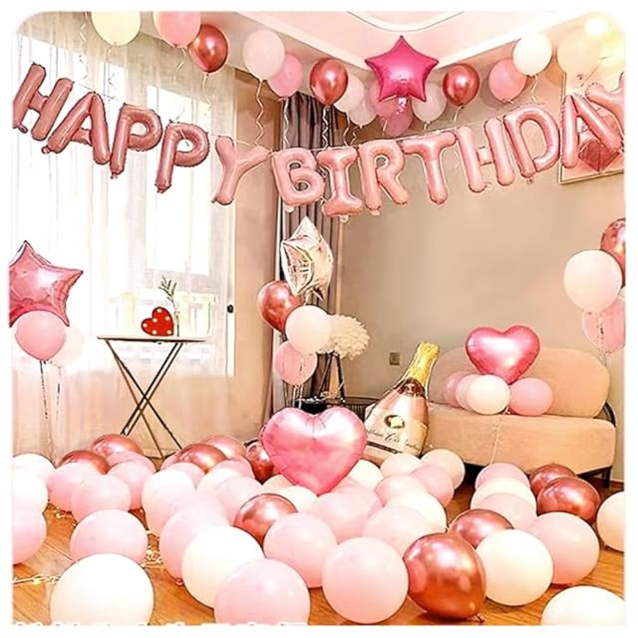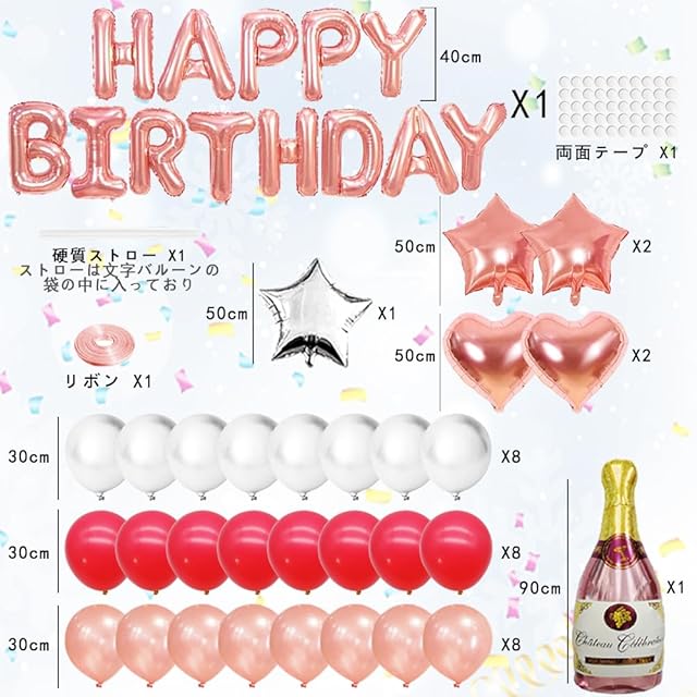 ① 誕生日飾り用バルーンセット 16 "ハッピーバースデーアルファベットバルーン1セット、リボン 10m、18インチハート型バルーン2個、18インチ星型バルーン3個、1個ボトル形バルーン(90cm)、ローズゴールドの風船+赤ですの風船+白ですの風船 合計24個(肥厚バルーン)、グルードット1パック、硬質ストロー1本(ストローは文字バルーンの袋の中に入っており)。