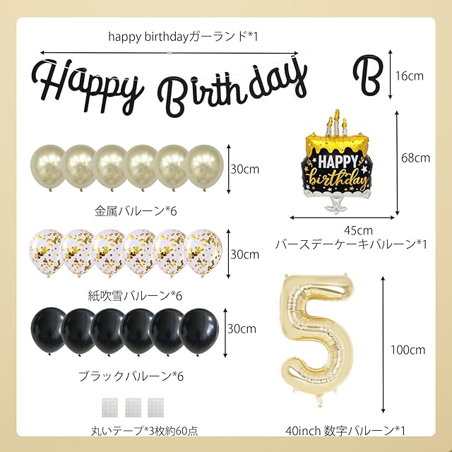 セット内容:<br>HAPPY BIRTHDAY ガーランド*1<br>ゴールド紙吹雪風船*6<br>ゴールド金属バルーン*6<br>ブラックパステルバルーン*6<br>丸いテープ*3枚約60点<br>40inch ライト ゴールド 数字バルーン*1<br><br>高級感あふれる黒金テーマデザイン :<br>ブラックとゴールドのクラシックな組み合わせに、バースデーケーキバルーンと数字バルーンをプラス。スタイリッシュで華やかな誕生日の雰囲気を演出し、子供から大人まで幅広くご利用いただけます。誕生日パーティーはもちろん、記念日、成人祝い、テーマパーティー、卒業式など様々なお祝いの場面で活躍します。特別なひとときを華やかに彩ります。<br><br>充実のセット内容 :<br>数字バルーン、ケーキ型バルーン、ブラック&ゴールドのラテックスバルーン、ゴールドコンフェッティバルーン、HAPPY BIRTHDAYガーランドが含まれ、これ一つで完璧な誕生日デコレーションが完成します。<br><br>高品質素材で安心 :<br>アルミフィルムバルーンと厚手のラテックス素材を採用し、光沢感があり丈夫で破れにくい設計。膨らませた後も長時間形を保ち、安心してお使いいただけます。<br><br>簡単に飾り付け可能:<br>バルーンは空気・ヘリウム両方に対応し、ガーランドは吊るすだけ。数分で簡単に飾り付けができ、思い出に残る素敵なパーティーを演出できます。<br><br><br>