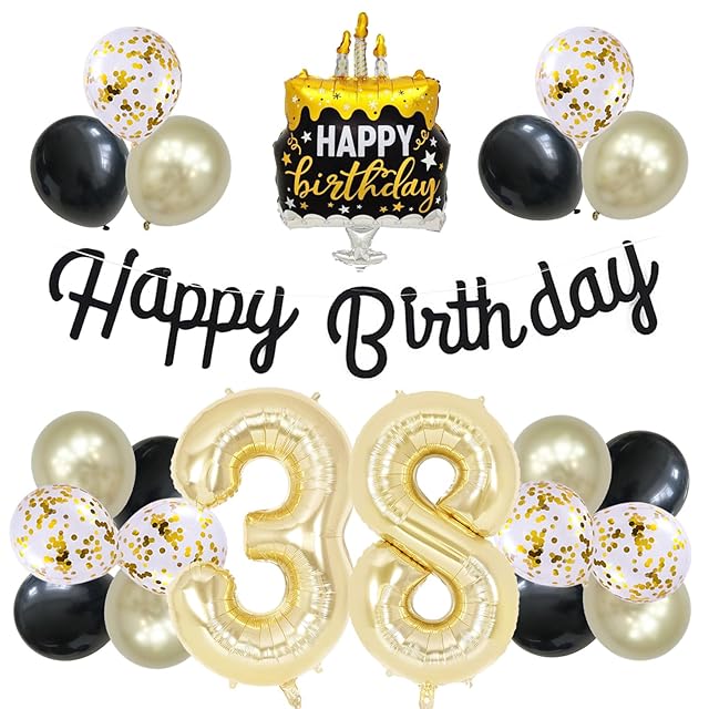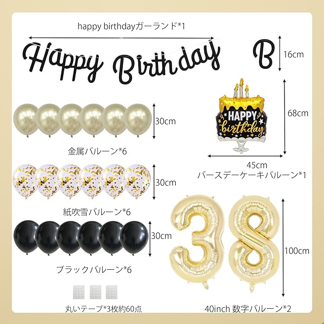 38歳 誕生日 バルーン 風船 セット 大きい 40inch ライト ゴールド 数字 バルーン 38 付け 約100cm シンプル 黒金 ケーキ 誕生日 飾り ハッピー バースデー HAPPY BIRTHDAY ガーランド 12inch ゴールド ブラック 風船 18pcs 飾り付け セット 子供 女の子 男の子 大人
