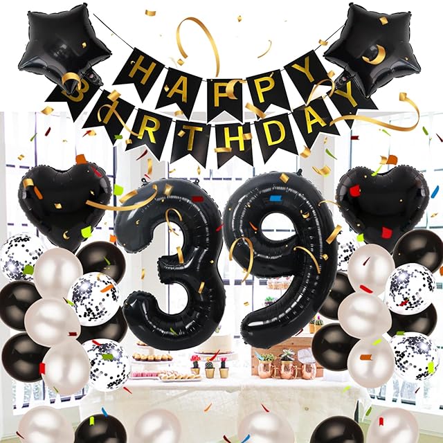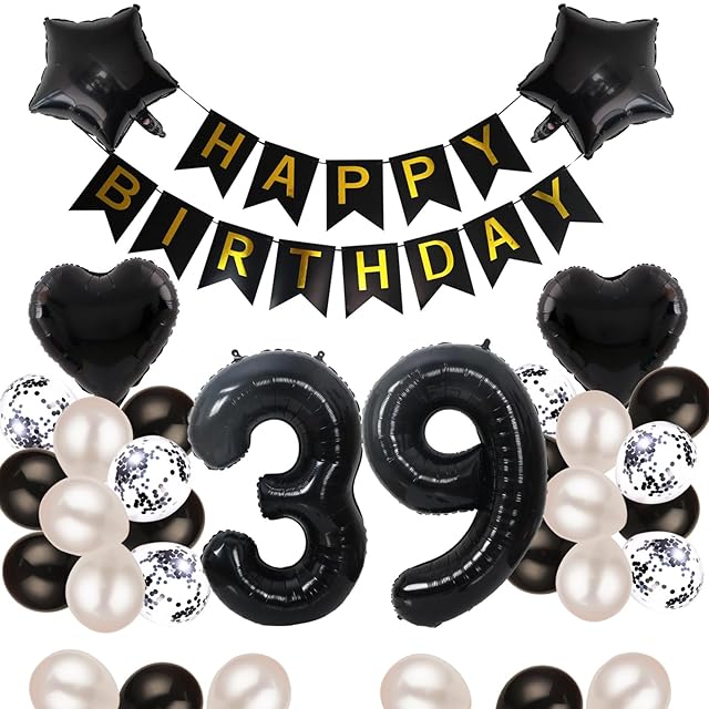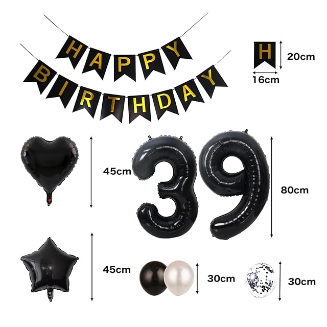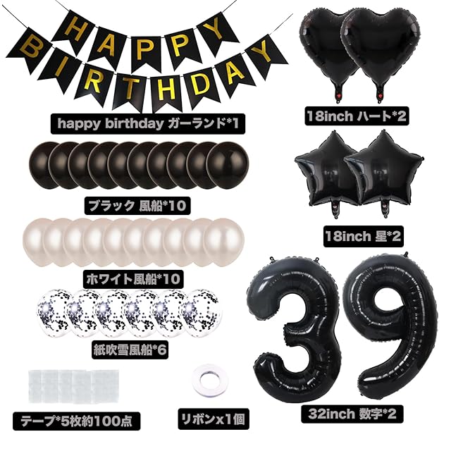 39歳 誕生日 バルーン 風船 飾り付け セット 数字バルーン 39 HAPPY BIRTHDAYガーランド ハート風船 紙吹雪風船 バースデーバルーン 大人 男の子 女の子 ブラック