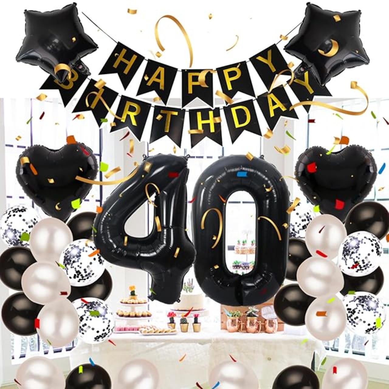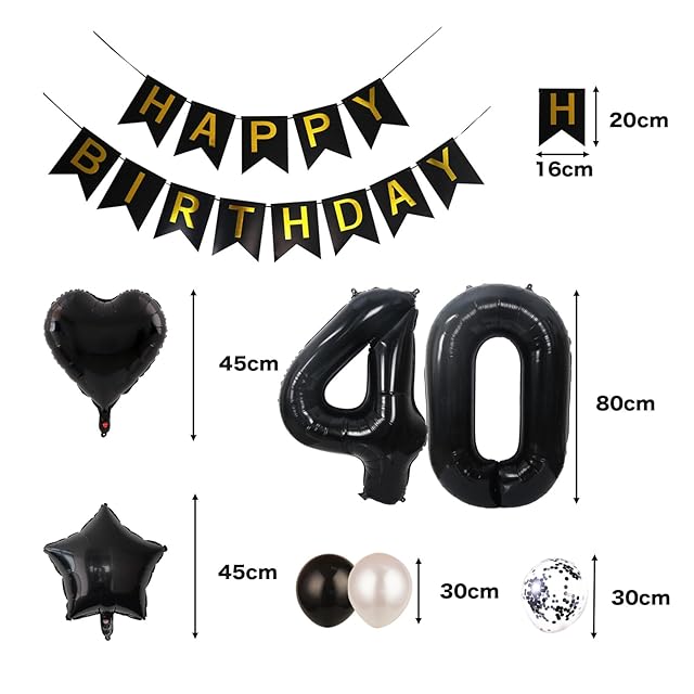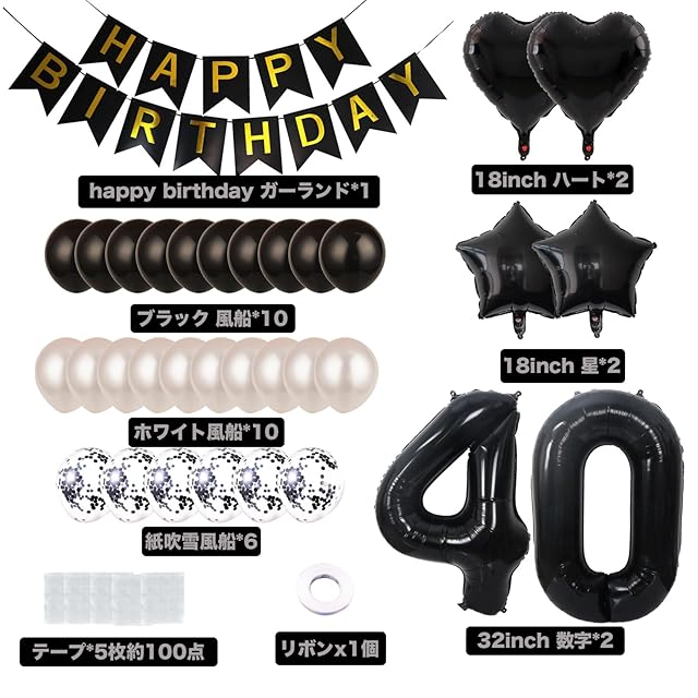 40歳 誕生日 バルーン 風船 飾り付け セット 数字バルーン 40 HAPPY BIRTHDAYガーランド ハート風船 紙吹雪風船 バースデーバルーン 大人 男の子 女の子 ブラック