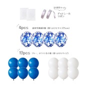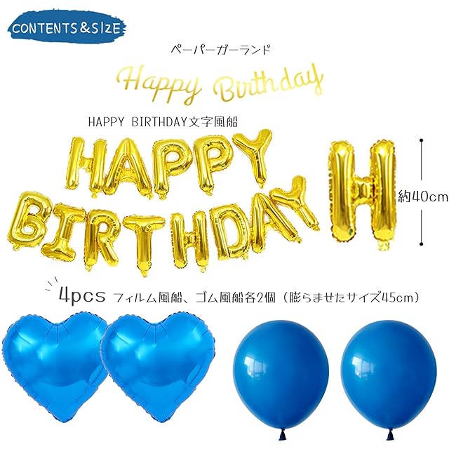 内容量(取り扱い:対象年齢6+以上):①Happy Birthday風船各文字×1 ②Happy Birthdayペーパーガーランド×1 ③ハート風船(45cm)×2 ④ブルー風船大(45cm)×2 ⑤紙吹雪風船(30cm)×4 ⑥ブルー風船小(25cm)×6 ⑦ホワイト風船(25cm)×6 ⑧カールリボン×2 ⑨ドットグルーシール×2