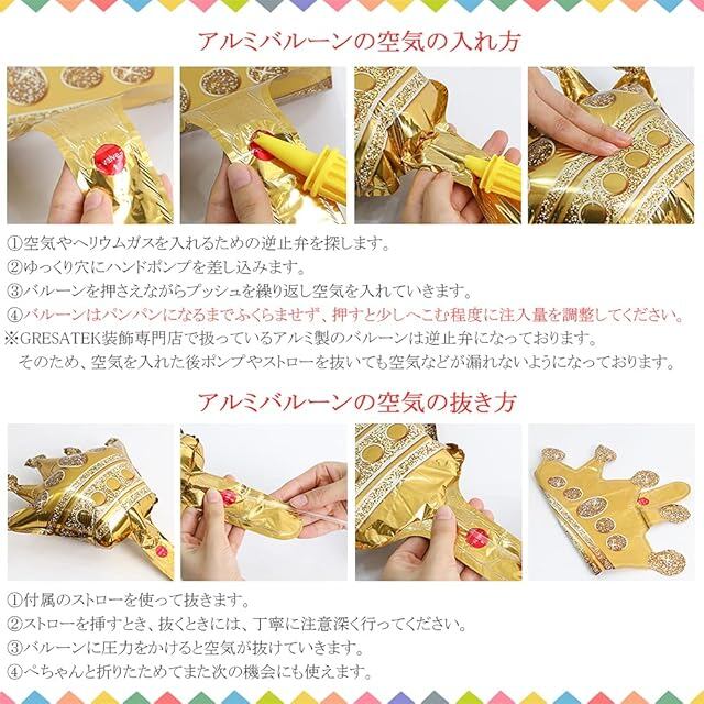 ➣カールリボンのご使用方法:HAPPY BIRTHDAYの13文字風船の上に紐を通す穴があります、付属のリボンを通すだけで素敵なガーランドが作れます。➣ドットグルーシールのご使用方法:膨らませた風船の接地面に1枚ずつ貼り付け、壁や天井などの表面に貼れます。風船同士を接着させ固定することもできます。