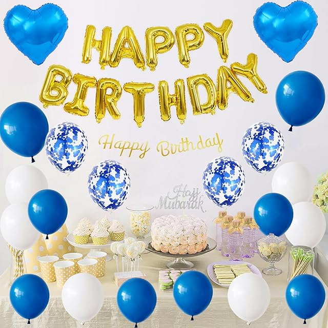 GRESATEK 誕生日 バルーン 飾り付けセット ハッピー バースデー HAPPY BIRTHDAY ハート 紙吹雪風船 両面テープ リボン付き ブルー ゴールド