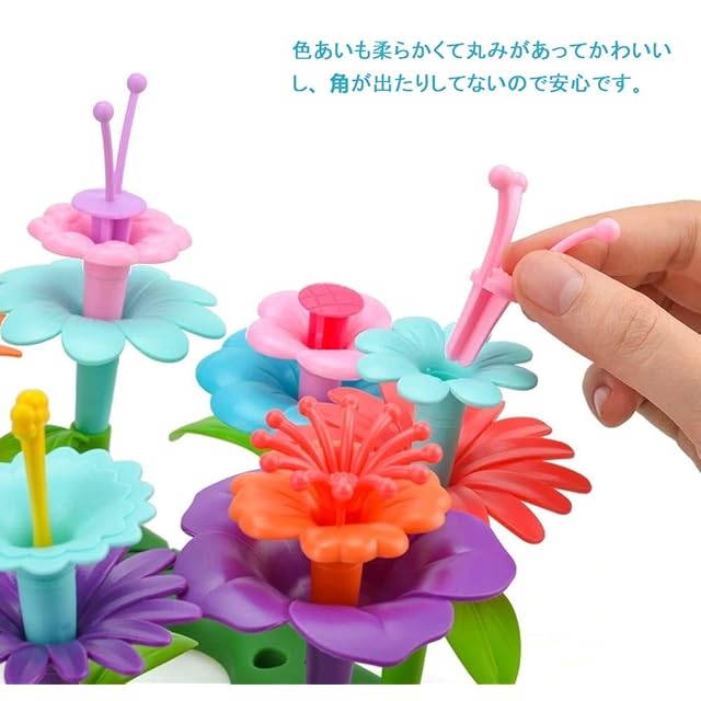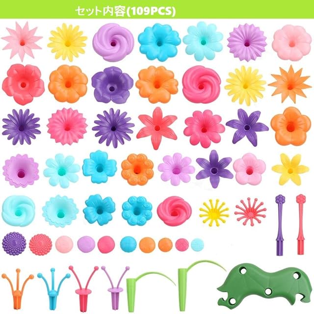楽しい知育玩具 非常に色鮮やかな色とりどりのパーツが109個入っており、花だけではなく茎や蕾あるいはその土台も再現できます。どんな花を組み上げていくかは子供の創造性次第です。</br> 指先の鍛錬に:つなぐ、はずすを繰り返し、指先を動かすことで脳の活性化に繋がります。</br> 知育玩具として最適です!自由自在に楽しく遊びながら、デザイン力、想像力・創造力、集中力など、さまざまな力が身につきます。</br> 安全材質 環境に優しいABS プラスチックを使用しており、丁寧な作りです、変な化学匂いなし、バリも残らないので、安心して遊んでいただくことができます~また、小さい子どものために、危険な角には全体的に丸み加工を施しており、安全面が抜群であり。</br>