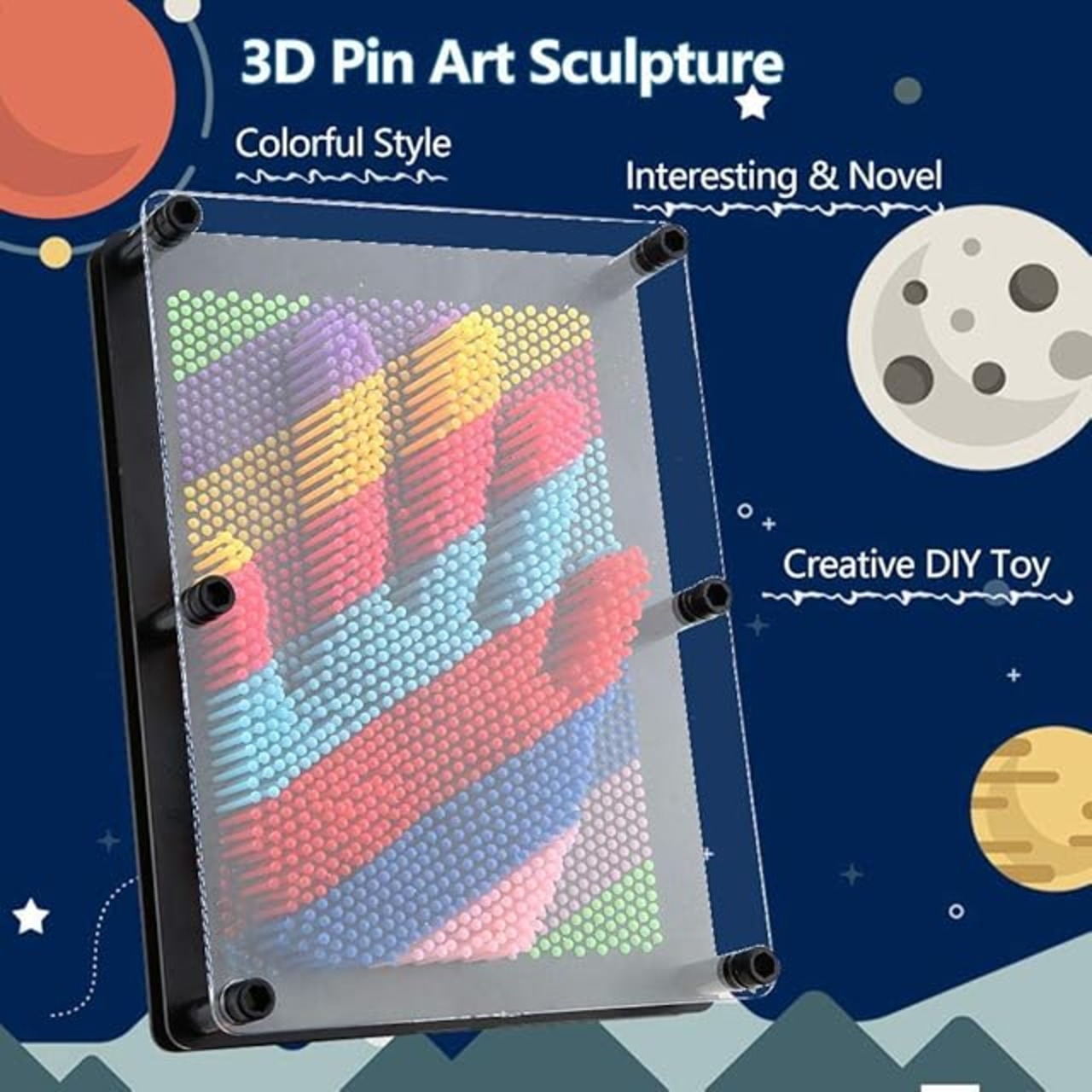【すごい3D彫刻】この商品は、手、顔、足、おもちゃなどをピンに乗せるだけで、すごい3D彫刻が簡単に作成できます。ピンの形状と配置によって、立体的な人物や動物、風景などを表現することも可能です。さらに、複数のピンを組み合わせてデザインを作成することもできます。この独自の創造的なプロセスにより、普段は見ることのない立体芸術を手軽に楽しむことができます。