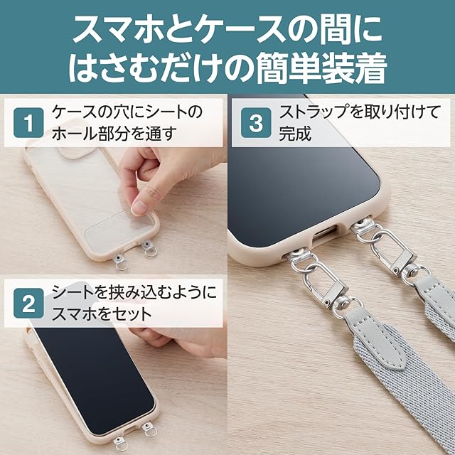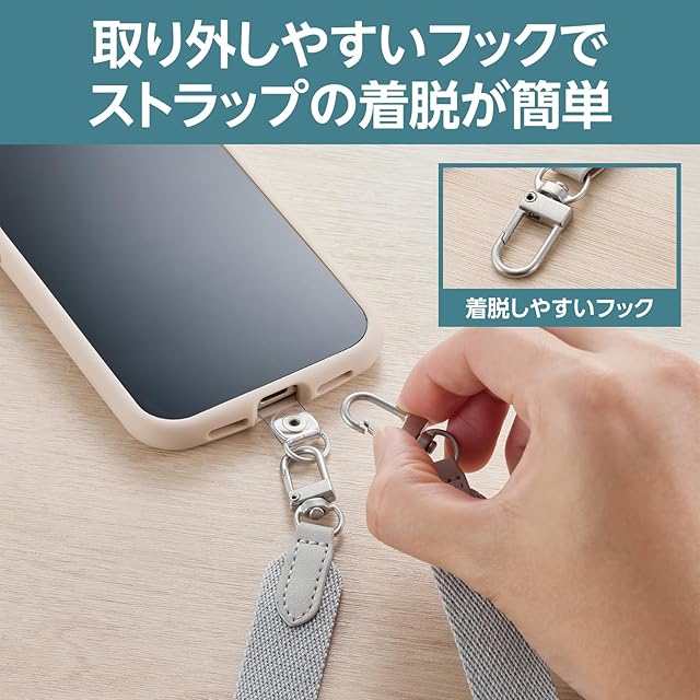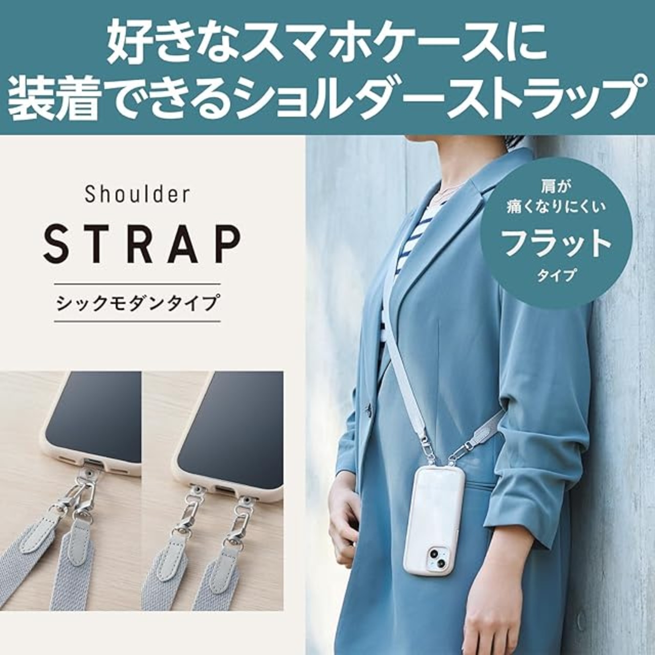 肩から掛けられ、バッグやポケットから取り出さなくてもすぐにスマートフォンの操作ができるフラットタイプのショルダーストラップです。
