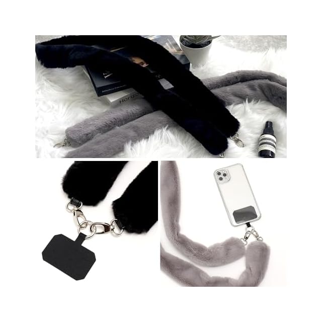 商品名:[リネーム] フリルストラップ スマホ ショルダー チュール アウトドア 首掛け かわいい 可愛い (グレー(ファー))