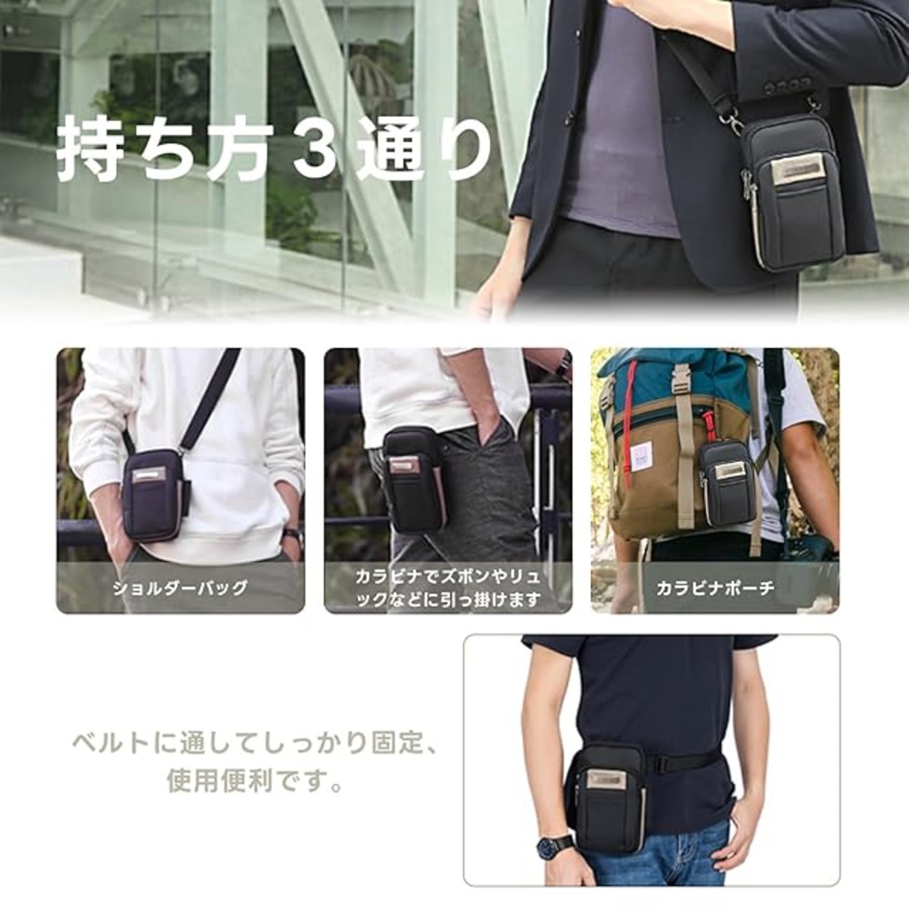 【持ち方3通り】ベルトポーチ・ショルダーポーチ・カラビナ取付ウエストポーチの3 wayで使用可能。カラビナで鞄に吊るしたり、付属のショルダー紐でショルダーバッグとして使用できます。