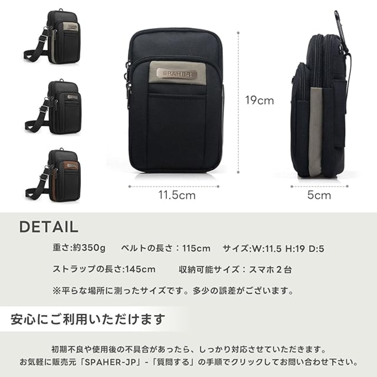 【サイズ】縦約19cm·横約11.5cm·幅約5cm;重さ:250g;素材:オックス。付属品:カラビナ*1、ショルダーストラップ*1(長さ調節可能)