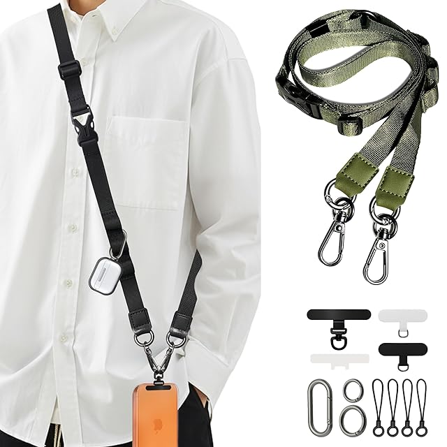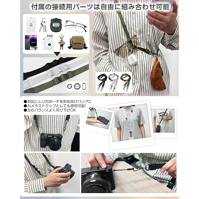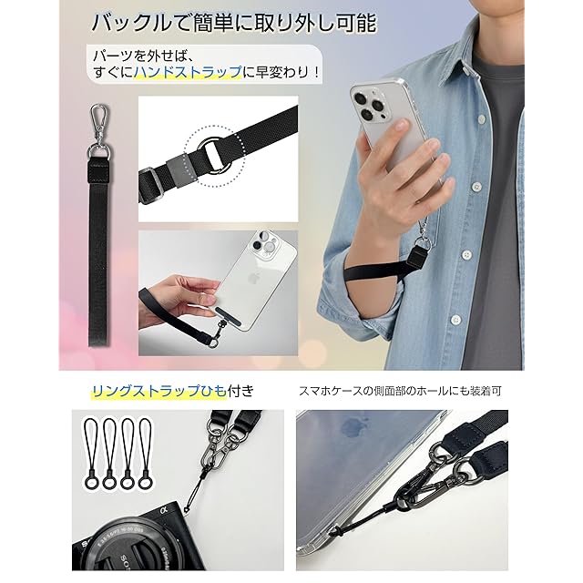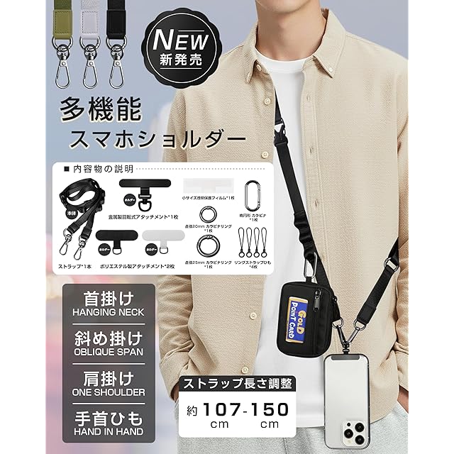 ■【首掛け/斜め掛け/肩掛け/ハンドストラップの4WAYで使用OK】</br> サイドリリースバックルで簡単に取り外し可能。パーツを外せば、すぐにハンドストラップに早変わり。長さ調節自由で、短くしてネックストラップ、長くしてショルダーストラップとして使用できます。</br> ■【多機能ショルダーストラップ】</br> ・「耐荷重」 約1.5kg</br> ・「ストラップ」長さ約90~150cm</br> ・「金具」 高品質亜鉛合金</br> ・「ベルトの幅」約1.5cm</br> ・「ケーブル穴差し込み部」約幅0.75cm</br> ■【金属製回転式アタッチメント・ポリエステル製アタッチメント】</br> 超薄型304ステンレス鋼素材、厚さ0.18mm、スマートフォンにぴったりフィット!充電口に干渉しない設計で挟んだまま充電が可能。キズ防止保護フィルムでスマホの傷つきを防止します。柔らかい素材でケースや機器にキズがつきにくいです。</br> ■【3つのループ付き・リングストラップひも付き】</br> 約85~145cmまで調節可能なストラップには、3つのループ付き。直径約2cm/2.5cm/楕円形の大きめのカラビナを採用。スマホだけでなくカラビナ·キーリング·カードケース·鍵·手袋など、様々なアイテムの吊り下げが可能。</br> ■【高級で軽量なナイロン素材】</br> ショルダーの素材、上質なナイロン素材を使用長い期間が心地よく使用できます。繊細で滑らかな質感と、しっとりとした柔らかな手触りが特徴です。光沢があり均一な色合いで、硬度が高く優れた耐摩耗性を備えているため、長時間使用しても摩耗や破れにくく、汚れも水洗いで簡単にお手入れできます。</br>