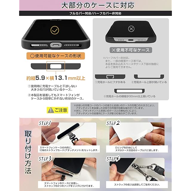 【アタッチメントホルダー・キズ防止保護フィルム付属】 金属製回転式アタッチメントは、超薄型304ステンレス鋼素材、厚さ0.18mm、スマートフォンにぴったりフィット!ストラップホールのないスマートフォンには、スマートフォンとケースの間にストラップカードを挟んでご利用頂けます。充電口に干渉しない設計で本製品を挟んだまま充電が可能。付属の小サイズ保護フィルムで、スマホの傷つきを防止します。ポリエステル製アタッチメントは柔らかい素材でケースや機器にキズがつきにくいです。「ケーブル穴差し込み部」約幅0.75cm