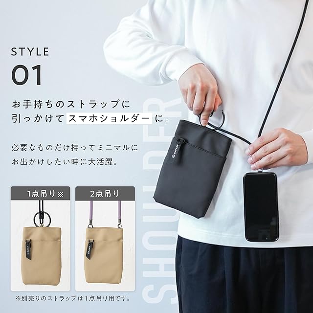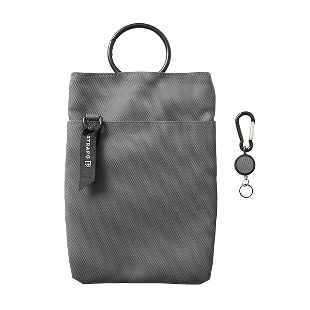 【4WAYで使えるスマホショルダーバッグ】①ショルダーストラップと組み合わせてショルダーポーチに。②スマホストラップと組み合わせてスマホショルダーに。③ベルトループに引っかければベルトポーチに。④バッグ・かばんにつけてバッグポーチにしたり、中に入れてバッグインバッグにも。日々のスタイルに合わせて多彩な使い方ができます。<br> <br> 【収納力も◎】マチ付きで見た目よりも大容量。スマホや小銭入れなどを入れられるメインポケットと2つのサブポケットの他に、小さめの小物が取り出しやすいチャック付きポケットも付いています。ストラポ1つで身の回りの小物や貴重品をまとめて持ち歩くことができます。<br> <br> 【外出先のちょっとした離席時や手荷物を預ける時に】「外出先のカフェでちょっとお手洗いに離席したい」「イベントなどで手荷物を預ける時に貴重品だけ手元に持っていきたい」「必要最低限の物だけ持って身軽に動き回りたい」そんな時にストラポはぴったりです。様々なファッションに合わせやすく、105gと軽量なので、お洒落に&身軽に持ち歩けます。<br> <br> 手帳型ケース、背面ポーチつきのスマホケースを入れるとマグネットが閉まらない場合があります。<br> <br> 【素材・サイズ】ストラポ本体:PVC加工ナイロン、ポリエステル、ABS樹脂、磁石、合金、ポリエステル/ 幅135x高195x厚20mm 72g 、ストラポ丸カラビナ: 合金/ 外径60mm 太さ5mm 21g、ストラポキーリール:アルミ、亜鉛合金、ステンレス、PVC加工ナイロン/幅20x高87x厚9.5mm 12g