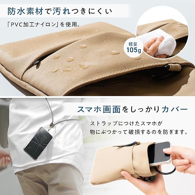 【外出先のちょっとした離席時や手荷物を預ける時に】「外出先のカフェでちょっとお手洗いに離席したい」「イベントなどで手荷物を預ける時に貴重品だけ手元に持っていきたい」「必要最低限の物だけ持って身軽に動き回りたい」そんな時にストラポはぴったりです。様々なファッションに合わせやすく、105gと軽量なので、お洒落に&身軽に持ち歩けます。