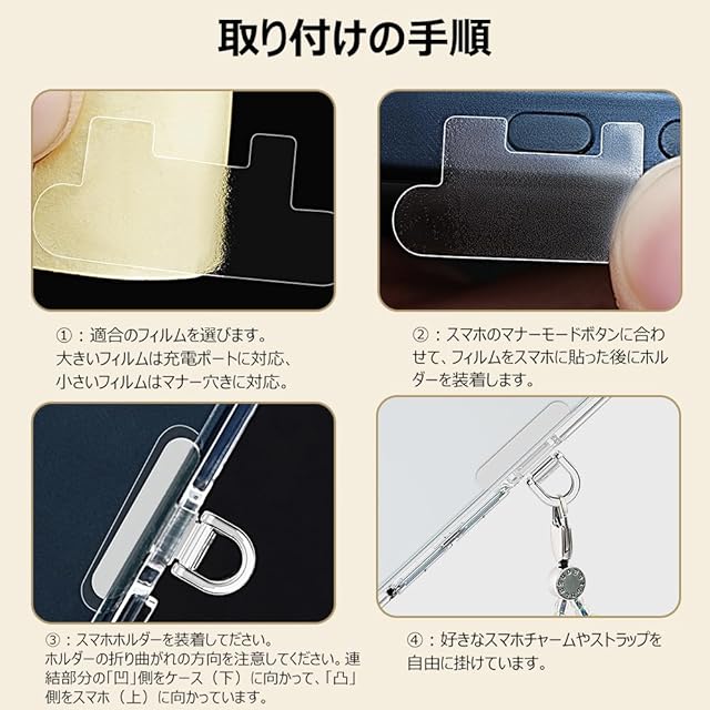 【2枚傷防止フィルム付き】:2枚傷防止フィルムを付属されて、大きいフィルムはホルダーが充電ポートに装着する前に、スマホの充電口の周りに貼ってください。小さいフィルムはスマホのマナーモードボタンの位置を装着する前にスマホのボタンの周りに貼ってください。全方位からスマホの傷を防止します。