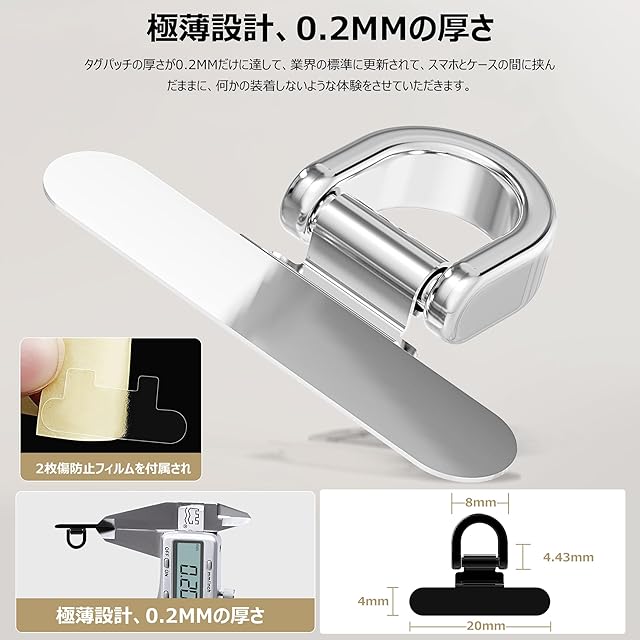 【極薄設計、0.2MMの厚さ】:目前、この製品は業界の中で一番薄さが0.25mm又は0.3mmですが、本社は製品の装着感と互換性を強化されるように、タグパッチの厚さが0.2MMだけに達して、業界の標準に更新されて、スマホとケースの間に挟んだままに、何かの装着しないような体験をさせていただき、スマホホルダーが極薄設計なので、スマホが浮き上がる問題点と互換性をご心配しないでください。