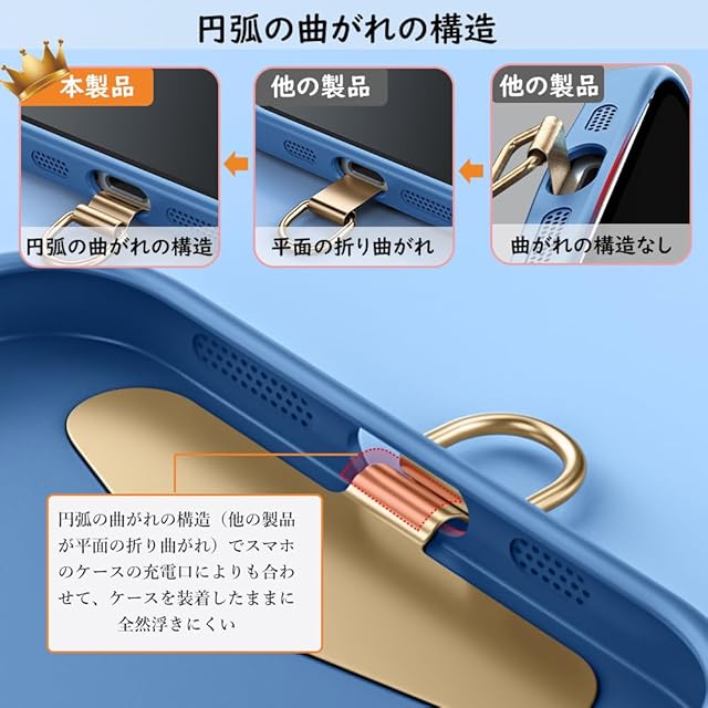 【革新版、浮きにくい湾曲設計】:この新発売のスマホストラップホルダーは金属リングと本体の間での連結金属部分は折り曲がれて段差になり、ケースを装着したままに全然浮きにくい、さらに本ストラップホルダーを挟んだままに、充電ケーブルもワイヤレス充電も支障しないます。