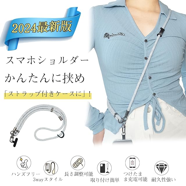 【様々な場面で使えるスマホアクセサリー】 スマホを入れるポケットやバッグがない時に大活躍するスマホショルダーストラップです。ポケットのないファッションでも肩にかけるだけでスマホをサッと取り出せます。両手がふさがる旅行先でも重宝します。日常、スマホ決済もらくらくスムーズ。お子さまから手が離せない時にも役に立ちます。