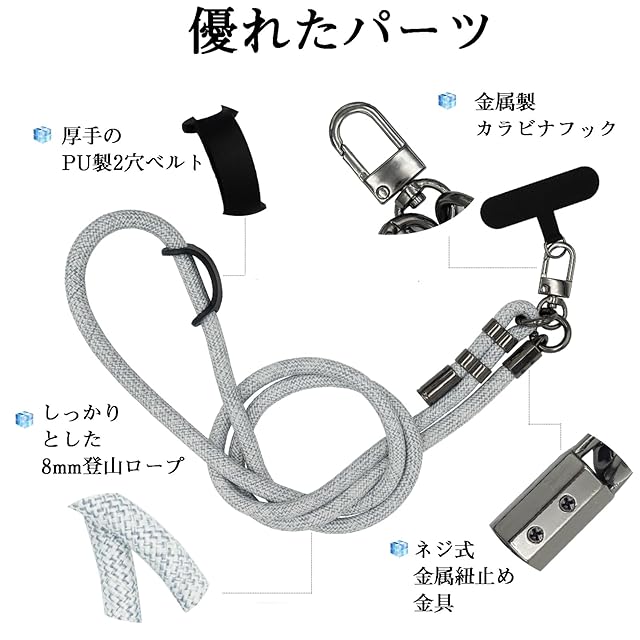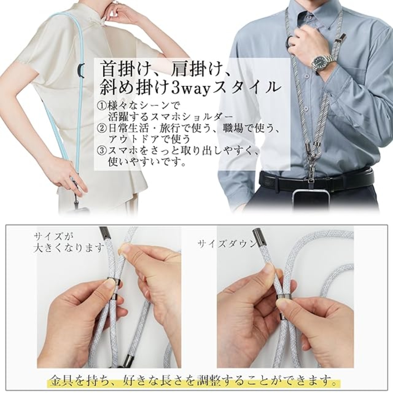 【安定性とファッション性が両立するスマホストラップ】 スマホ ショルダーストラップは丈夫で耐摩耗性に優れた8mm太さの登山ロープを採用しています。使う金具は錆びない、耐摩耗性、耐腐食性の亜鉛合金素材で作られています。鍵を付けたり、コインケースやパスケースを繋いだりと、マルチにネックストラップとしても使えます。男女兼用・ユニセックスで使えます。