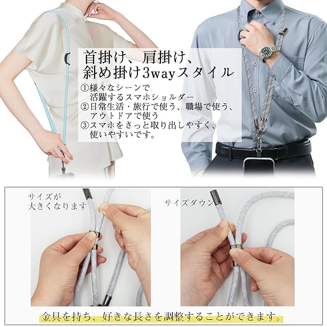 【スマホ ショルダーの製品仕様】 スマホ ショルダーの長さ調整範囲:約60~120cm、紐の太さ8mm、重量:約60g。セット内容:ショルダーストラップ*1本、スマホホルダー*2枚、カラビナリング*2個、S字カラビナ*1個、小さいストラップ リング* 2個 、miniサイズからビッグサイズまで、男女兼用ですべてのスマートフォンに対応したサイズとなっております。