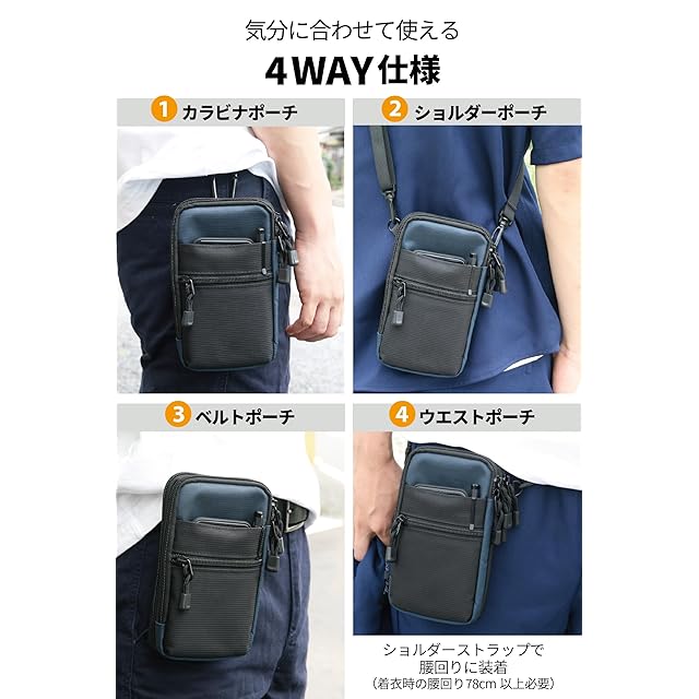 ✅【4通りの使い方が便利 】 カラビナポーチはもちろん、ベルトポーチ、ショルダーポーチにもなり、ショルダーストラップの長さを短く調節すると、ウエストポーチにすることも可能(着衣時の腰周り78cm以上必要)。服・季節に合わせて様々な使い方ができる便利なポーチです ✅リュックの時はスマートフォンや携帯がすぐに取り出せて快適に。ウォーキングや買い物など、最低限のものを入れてサッと身軽に出かけたいときにも最適。