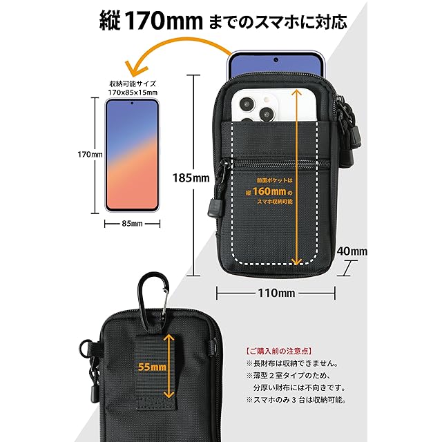 ✅【 最低限の持ち物をコンパクトに 】 スマートフォン、鍵、小銭入れなど、最低限の持ち物を携帯するのに適した薄型のポーチ。メイン収納が2室あり、スマホや携帯電話と小物を分けて収納できます。スマホ2台を別々に収納可能。収納できるスマホは、手帳ケースに入っていない6.5インチ前後まで(サイズ目安:縦17cm✕横8.5cm)。※手帳型ケースは厚みが増すため、縦16.3cmまでが推奨サイズです ✅※注意※薄マチのため、厚みのある二つ折財布は収納できません。長財布は縦の寸法が足りないため収納できません。