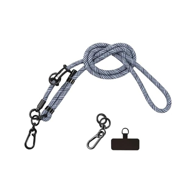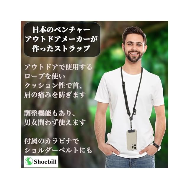 アウトドアロープを使用した、耐久性とファッション性を兼ね備えたスマホショルダーストラップです。 直径10mmと8mmの太めクッションストラップで、首や肩が痛くなりにくく快適。長さ調整機能付きなので、性別・年齢を問わずお使いいただけます。 スマホホルダーは充電口に差し込むだけで簡単装着OK。さらにカラビナも付属し、バッグやポーチに取り付けてショルダーベルトとしても活用可能。 スマホをおしゃれに持ち運びながら、落下や紛失を防止。両手が自由になることで、通勤・買い物・旅行など日常のあらゆるシーンで活躍します。