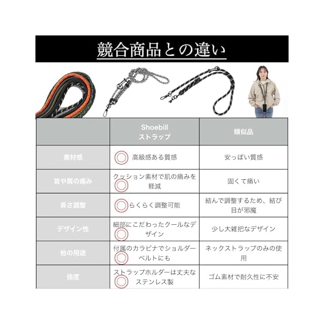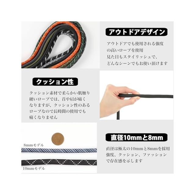 ✅ 【クッション性のある太めストラップ】 直径10mmと8mmの極太ロープを採用。クッション性があり、長時間使用しても首や肩が痛くなりにくい柔らかさです。