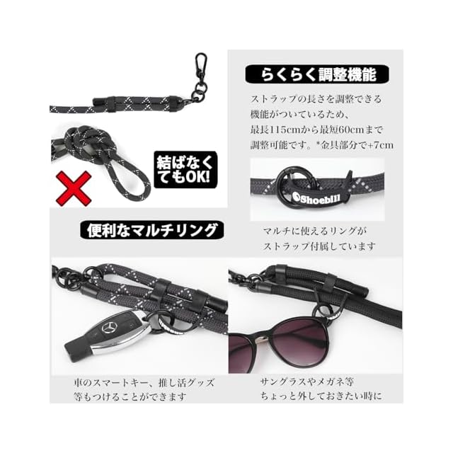 ✅ 【便利なリング付き】 サングラス、メガネ、推しグッズなどを一時的に掛けられるリングをストラップに搭載。お出かけ時に便利。