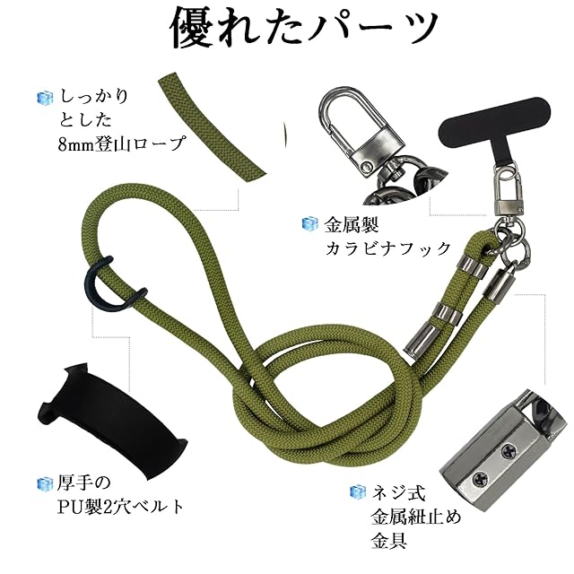 【安定性とファッション性が両立するスマホストラップ】 スマホ ショルダーストラップは丈夫で耐摩耗性に優れた8mm太さの登山ロープを採用しています。使う金具は錆びない、耐摩耗性、耐腐食性の亜鉛合金素材で作られています。鍵を付けたり、コインケースやパスケースを繋いだりと、マルチにネックストラップとしても使えます。男女兼用・ユニセックスで使えます