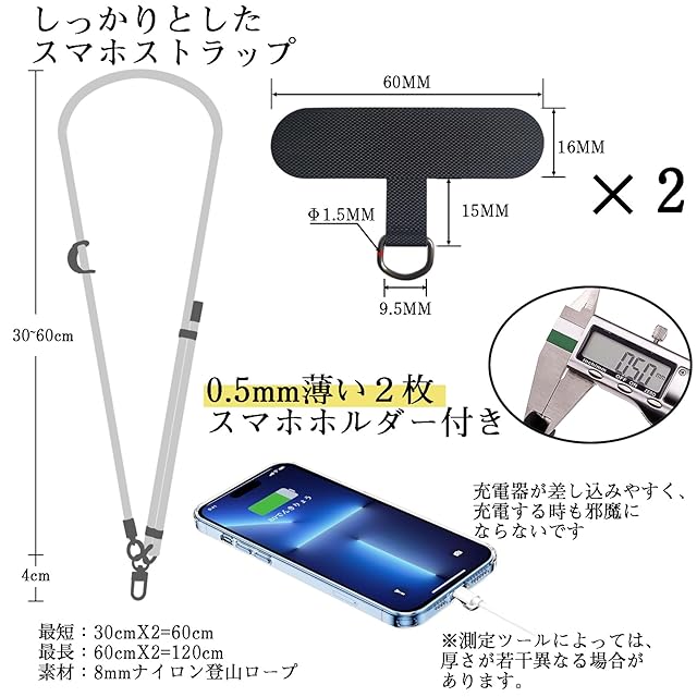 【スマホ ショルダーの製品仕様】 スマホ ショルダーの長さ調整範囲:約60~120cm、紐の太さ8mm、重量:約60g。セット内容:ショルダーストラップ*1本、スマホホルダー*2枚、カラビナリング*2個、S字カラビナ*1個、小さいストラップ リング* 2個 、miniサイズからビッグサイズまで、男女兼用ですべてのスマートフォンに対応したサイズとなっております。