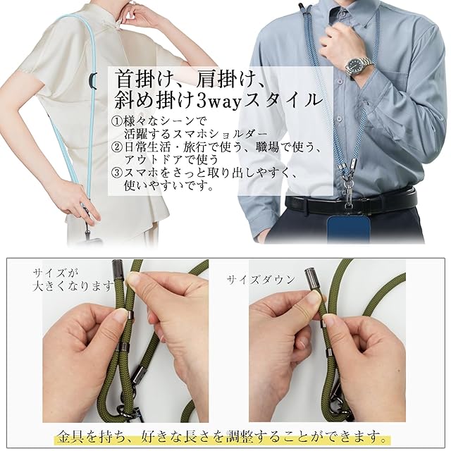 【3way ストラップ&取り付け簡単】 60-120cmに調節ができて、手で引っ張りながら長さを変えられる金具を締めていますので、斜めかけ、首掛け、肩掛け、1つで3通りの使い方が可能です。用途に合わせて、使い方をチェンジできる携帯ストラップです。取り付け方も簡単で、お持ちのスマホケースに付属のストラップホルダーを通すだけです。ホルダー部分は0.5mmと超薄型。不織布素材にコーティング加工を施し強度を高めています。