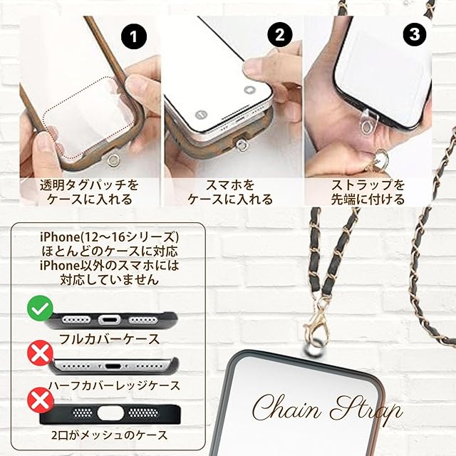 【スマホをもっと便利に、おしゃれに持ち歩くチェーンストラップ】軽量仕上げで長時間の使用でも疲れにくく、スマホやバッグ、小物にも使える万能アイテム。斜め掛けに最適な120cmサイズで両手が自由になり、通勤・通学・旅行・お出かけに大活躍。付属の透明タグパッチをケースに挟むだけで簡単に取り付け可能。iPhone12~16シリーズに幅広く対応し、フルカバーケースにも対応しています。カラーバリエーションは全14色、定番のブラックやブラウンから、華やかなレッド・ロイヤルブルー・ライトパープルまで豊富にラインナップ。ファッションに合わせて選べるのが魅力です。スマホショルダーとして落下防止にも役立ち、可愛さと実用性を兼ね備えたストラップは、プレゼントにもぴったり。毎日のコーディネートに華やかさを添える必須アクセサリーです。
