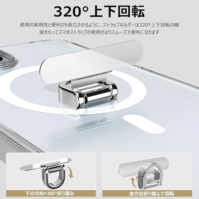 【320°上下回転、曲がれ設計】:使用の実用性と便利さを両立させるように、ストラップホルダーは320°上下回転と曲がれ設計の機能をもって、上下に320°自由に回転できるので、スマホストラップの使用がよりスムーズで便利になります。浮きにくい折り曲がれ設計、金属リングと本体の間での連結金属部分は折り曲がれて段差になり、ケースを装着したままに全然浮きにくい。