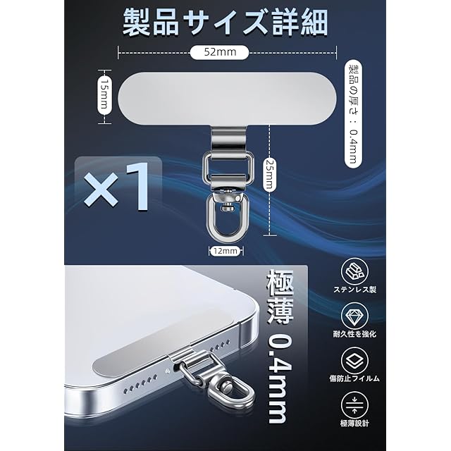 商品名:ZXZone ストラップホルダー【傷防止フィルム加工】 スマホストラップホルダー 折り曲げても浮きにくい設計・極薄0.2mmの金属製タグパッチ採用 落下防止首掛け斜めがけ肩掛け首かけ携帯ストラップ iphone android スマホアクセサリ全機種対応 (シルバー-TS)